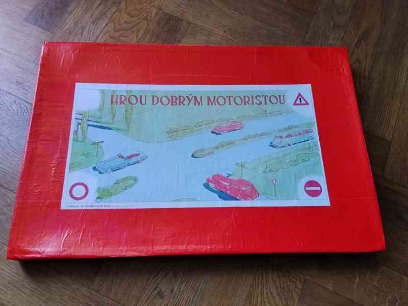 Pěkná zachová kompletní desková hra s dřevěnými autíčky z roku 1960. Opravená krabička.