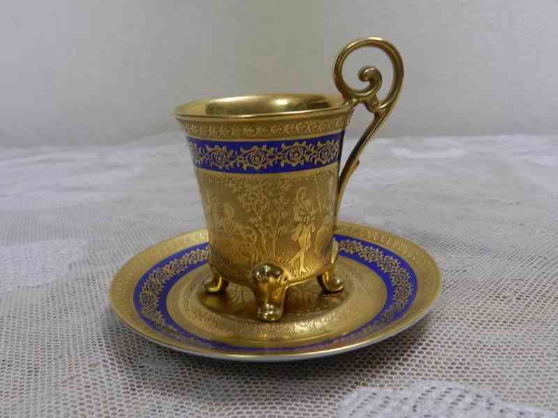Luxusní empírový bohatě zlacený hrnek na nožičkách, barva modrá, oroplastika - Karlsbad, 1 třetina 20 stol.