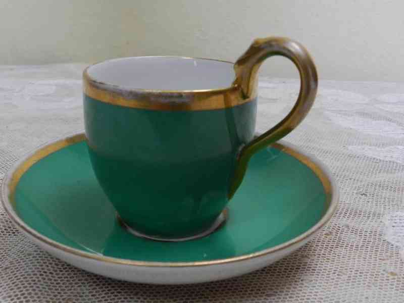 Hezký zelený zlacený Hrnek s podšálkem, Labuť - Značeno, Horní Slavkov, 2 čtvrtina 19 stol.