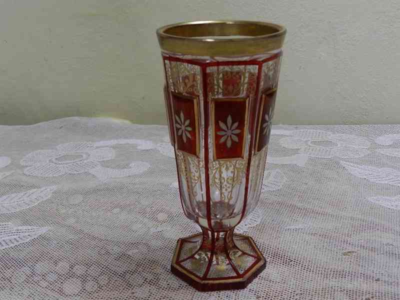 Zajímavá sedmiboká zlacená Sklenice, rubínová lazura - Čechy, 2 pol. 19 stol.