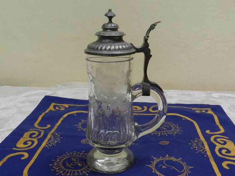 Krásný velmi starý zdobený Korbel s poklopem, Vinná Réva cejch 0,3l.