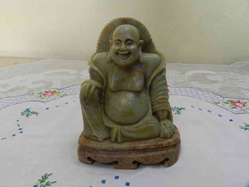 Hezká menší Soška, řezba, mastek, kamenný sokl, ruční práce, Budha - Shanghai.