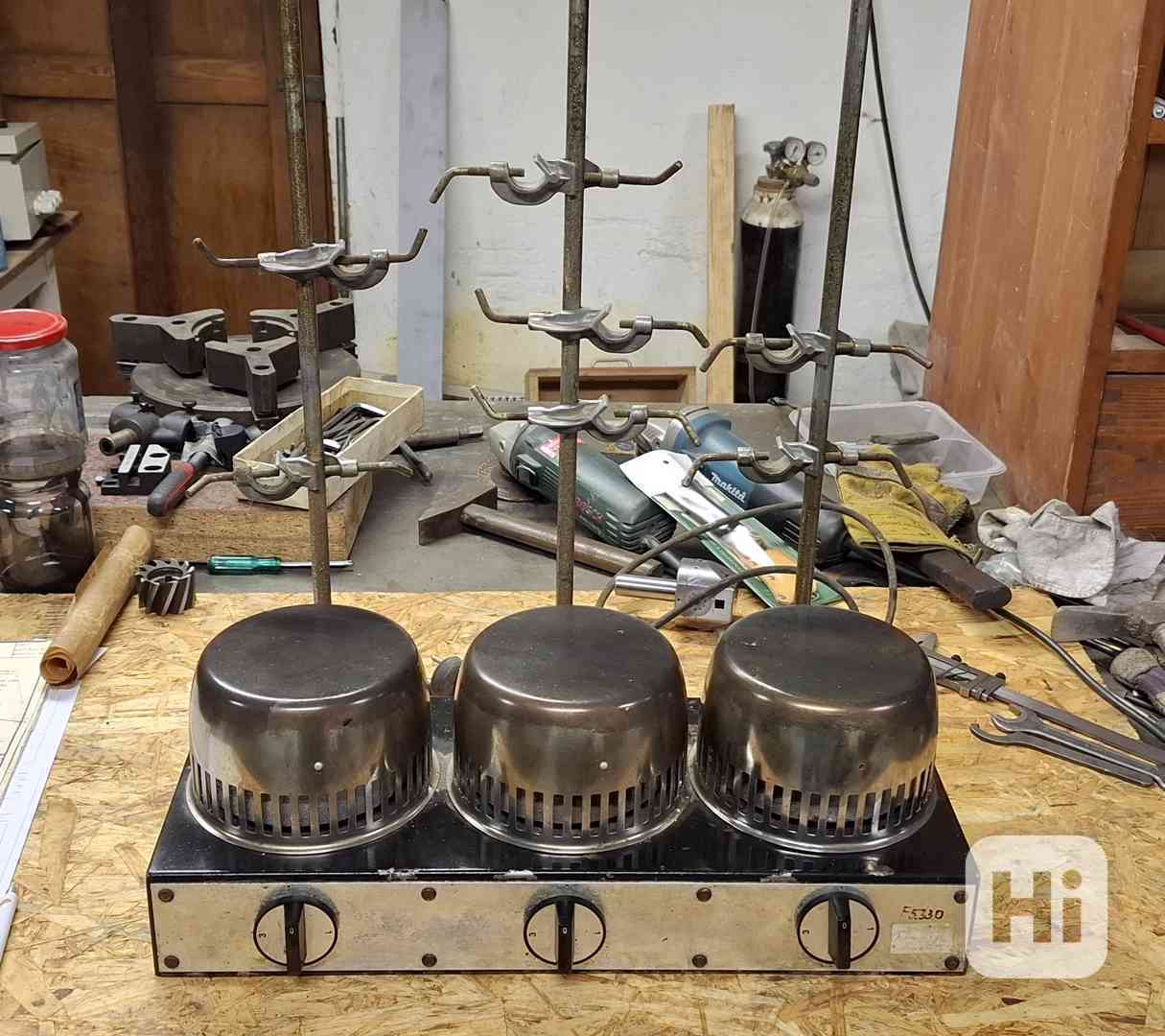 Prodám laboratorní tříplotýnkový vařič se stojany a držáky.